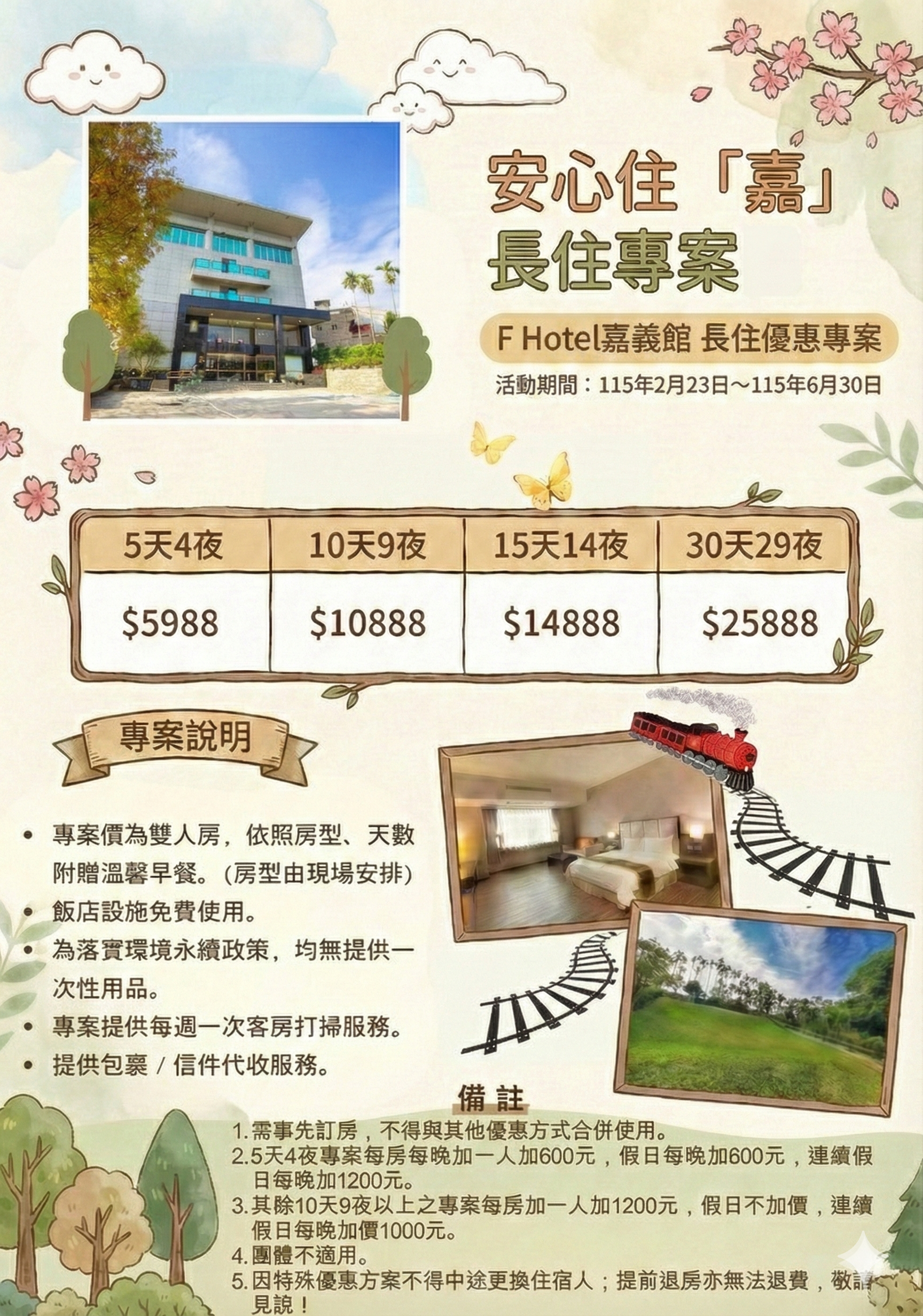 還有限量優惠專案等著您,歡迎來F HOTEL享受舒適便捷的悠閒住宿時光